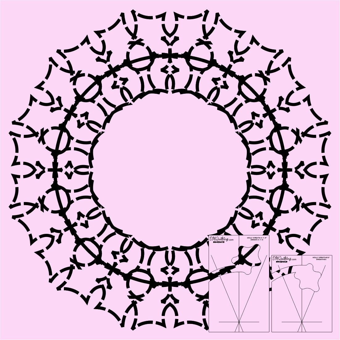 The HOLLY WREATH is designed with two templates. Use the larger size to stitch an outside measurement of 11.5″ in a circular pattern with the leaves on the outside of the ring. The smaller interior template will stitch an 8″ diameter pattern with the leaves inside the ring. Each template can be used independently or both together to create a full wreath. The circular ring develops automatically as you stitch with each template! Complement your project with the coordinating HOLLY LEAF SET!