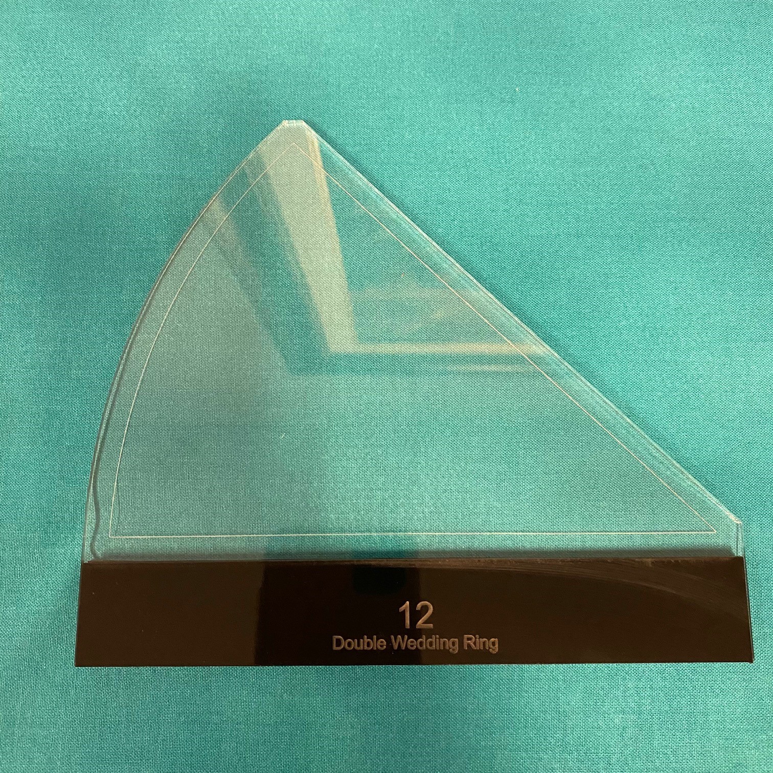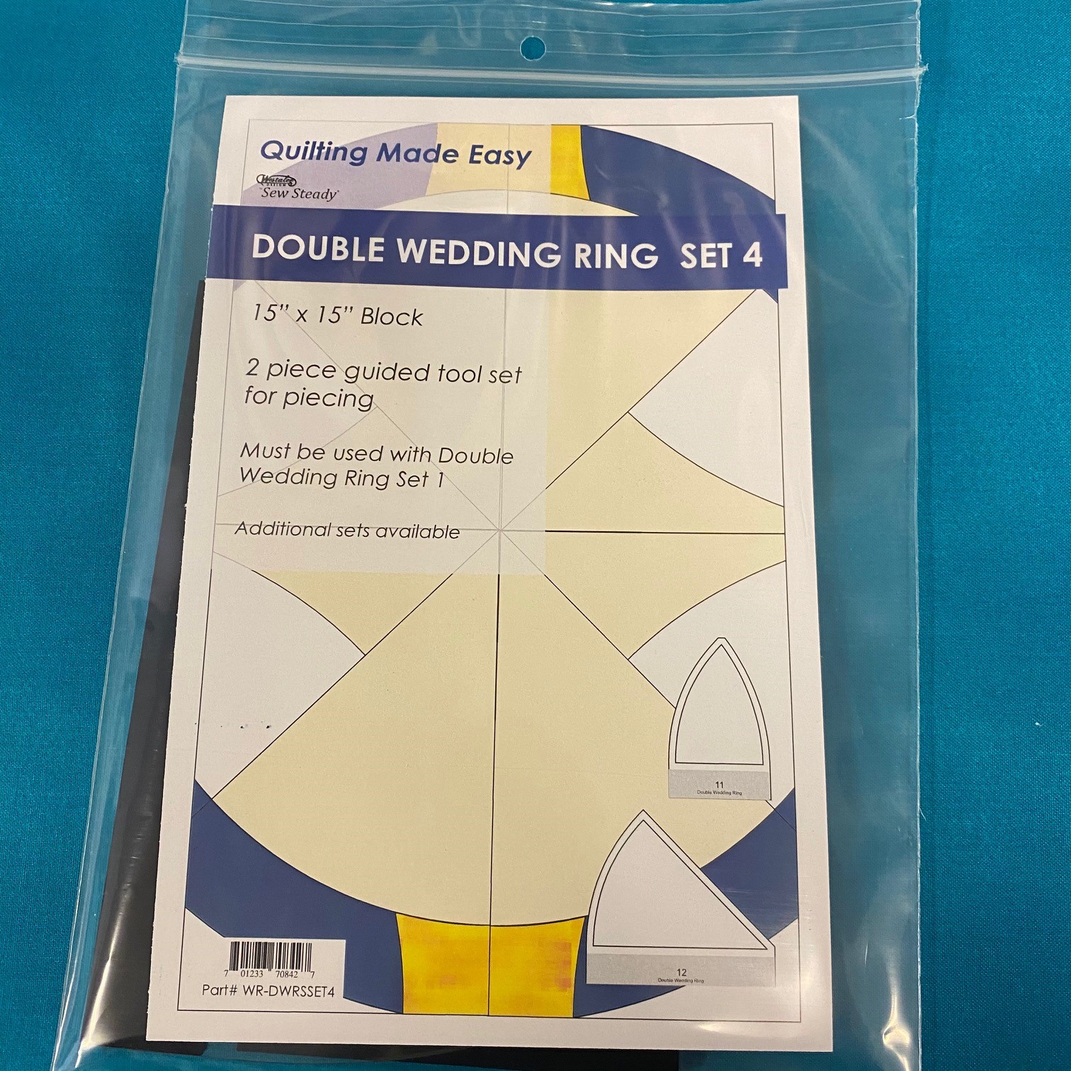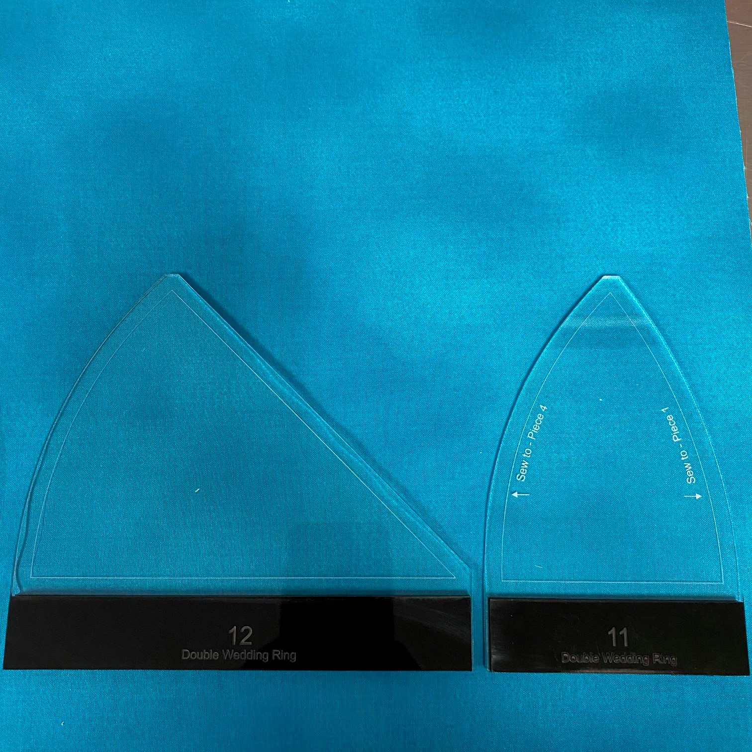 2pc guided tool set for piecing, based on a 15″ x 15″ block. Must be used with Double Wedding Ring Set 1. Set 4 includes the center variation.