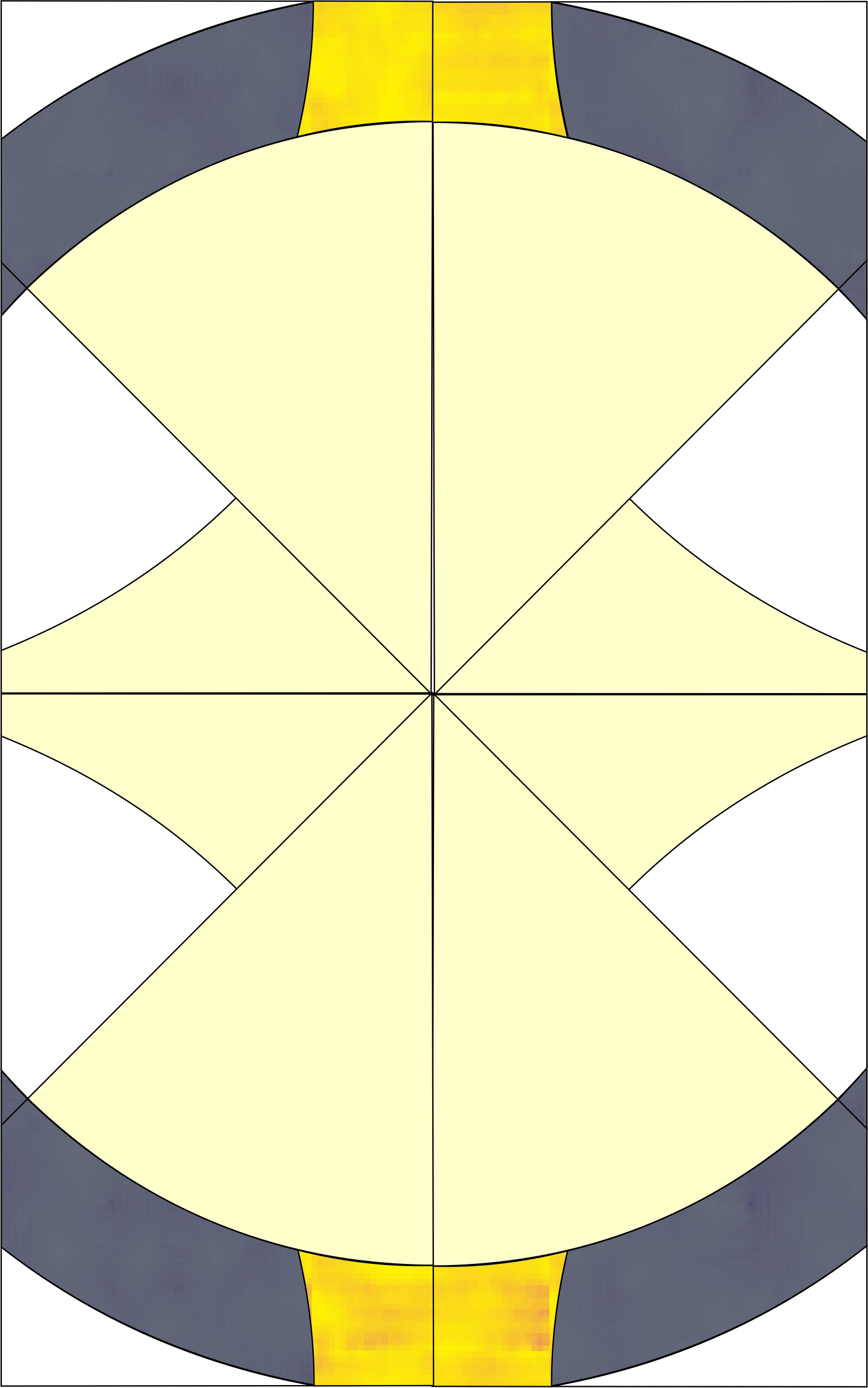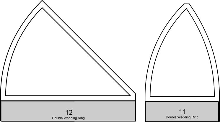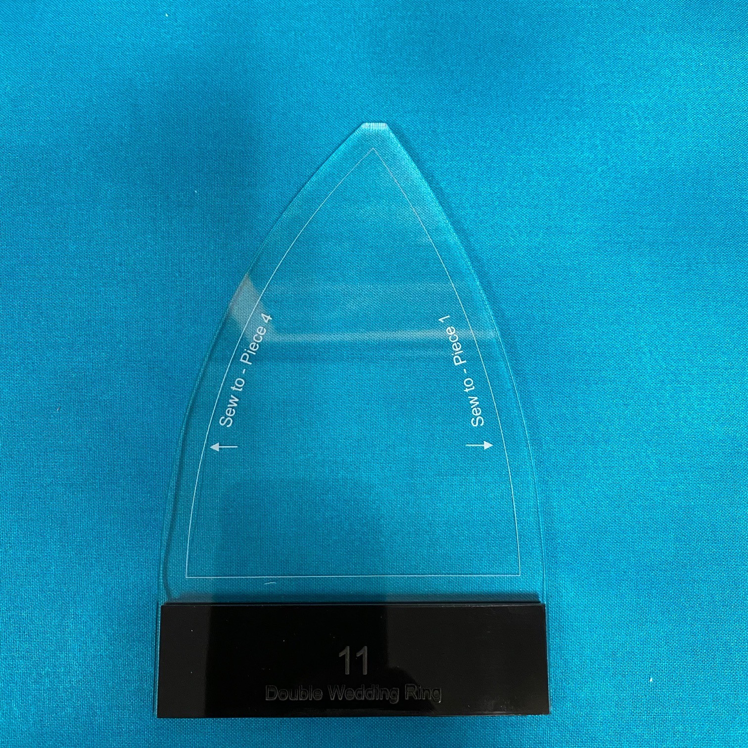 2pc guided tool set for piecing, based on a 15″ x 15″ block. Must be used with Double Wedding Ring Set 1. Set 4 includes the center variation.