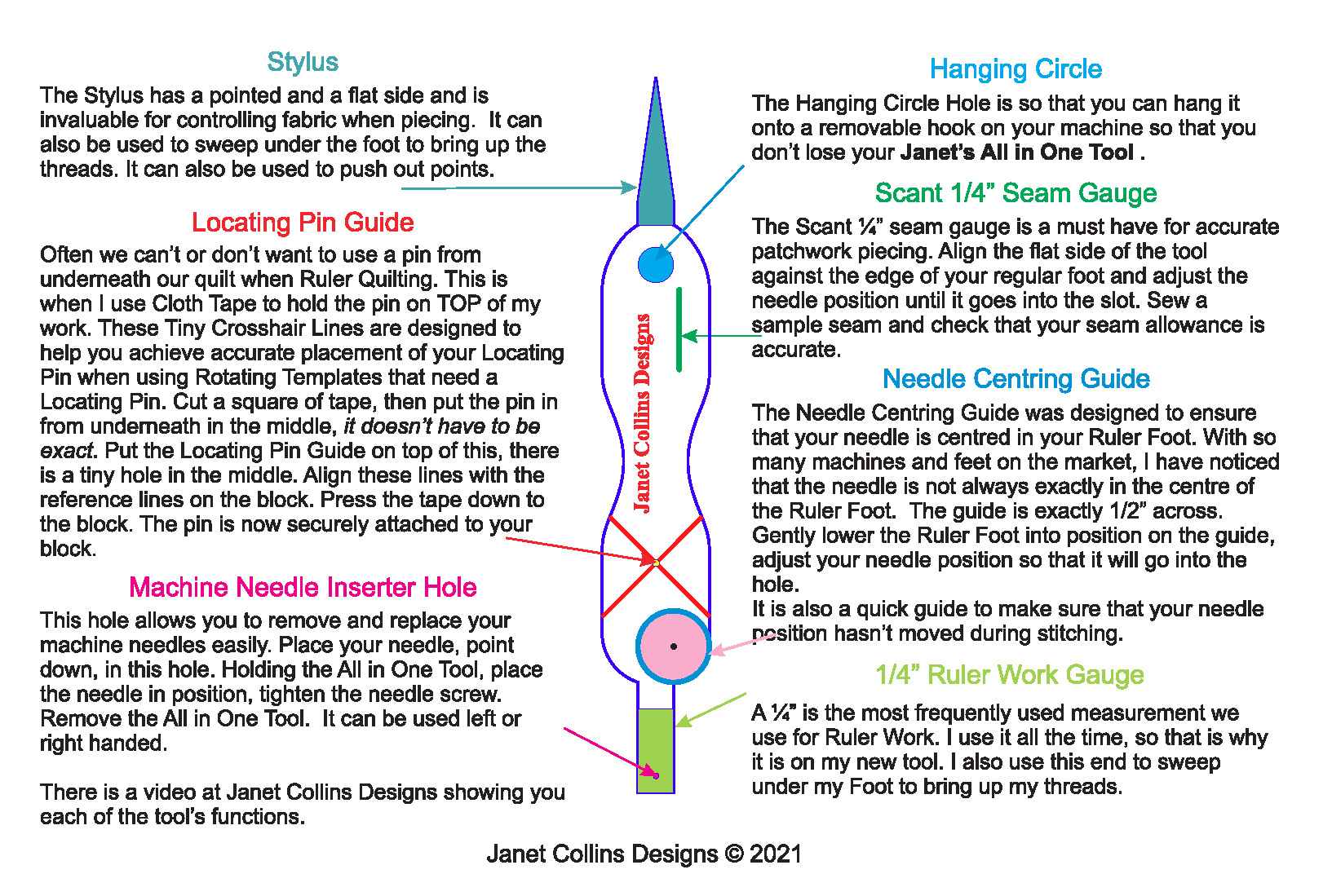 Janet’s All In One Tool, designed by Janet Collins, brings together her most used tools for patchwork and quilting.