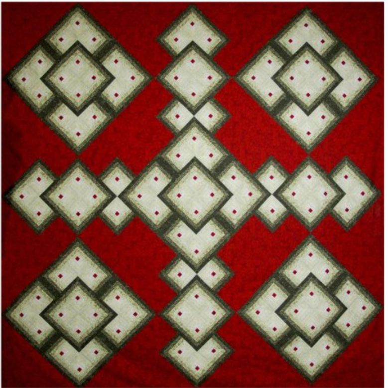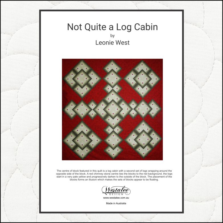 The centre of block featured in this quilt is a log cabin with a second set of logs wrapping around the opposite side of the block. A red chimney stone centre ties the blocks to the red background, the logs start in a very pale yellow and progressively darken to the outside of the block.