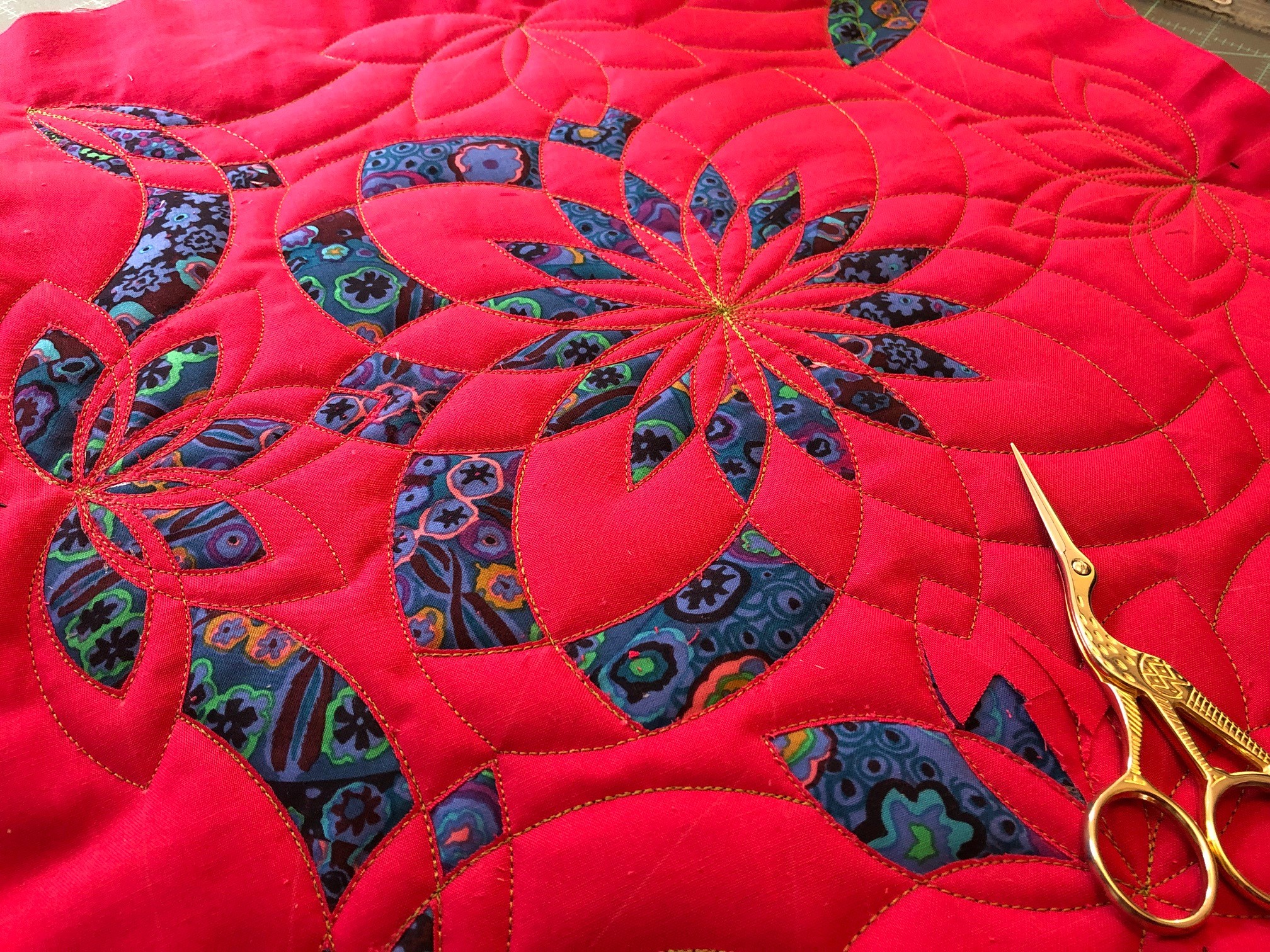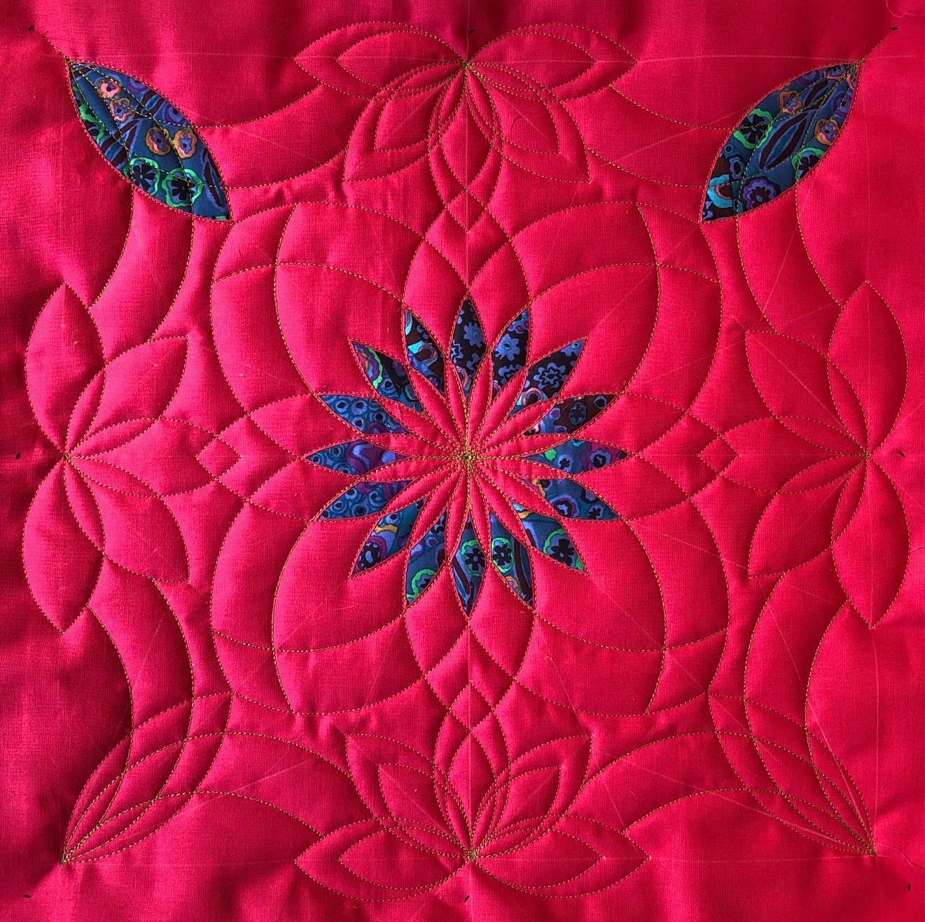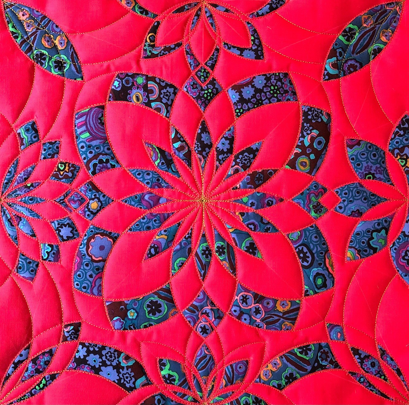 Petal Power showcases just how easy, versatile and effective simple curves can be in a quilting design. All of the petals are stitched using curves from the Westalee Design Sampler Template Set: 6″ Spiral, 4″ Arc and Clamshell are all used.