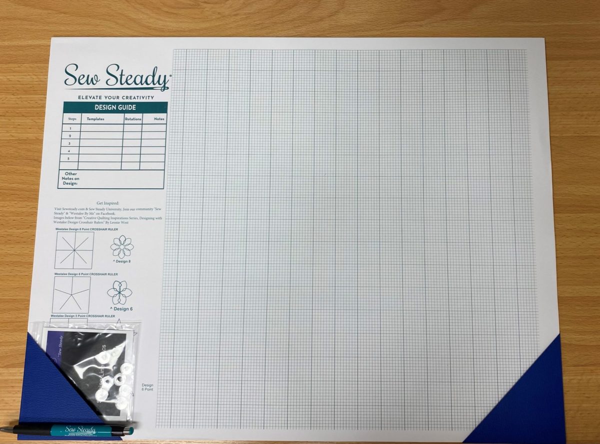 Sketch Pad & Design Guide is your ideal drawing space for your Westalee and Sew Steady Quilt Designs. With 25 sheets and overall size of 17″ x 22″. The ultimate drawing space for block designs with a 17” x 17” Grid – 1/8” grid (8 x 8 per inch) graph space on the right to create your design. Then on the left a guide to name you creations and list your step outs for each design.