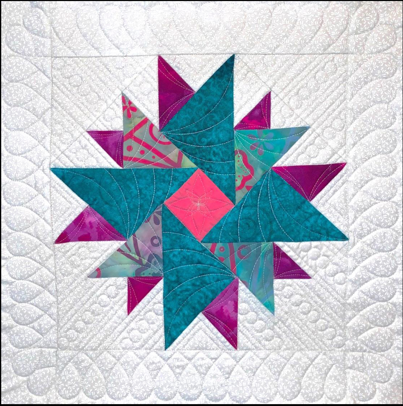 Patchwork Block Pattern only. Image is Featuring quilting designs using the Westalee Design Flower Power Template Set, this project guides you in the creation of a quilted block (approximately 12” finished size). With a 3” border