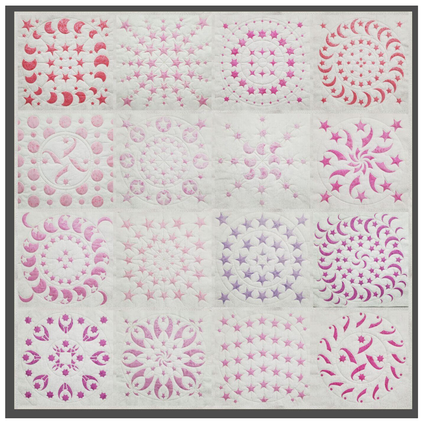Leonie West, the designer, lives in a beautiful part of the world, where tall trees reach for the sky and on clear nights the stars and the moon shine bright. Away from the city lights the stars shine brighter. The series of ruler and embroidery designs is created with this amazing inspiration.