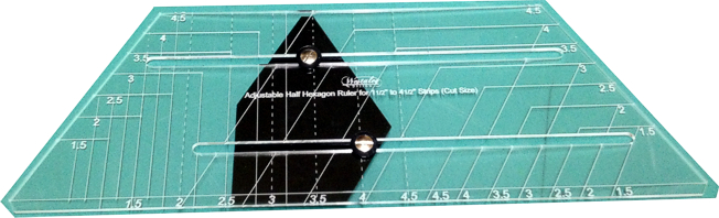 Easily and accurately cut the 5 components needed to make Half Hexagon blocks and quilts. The Adjustable Half Hexagon Ruler guide is used at both ends of the ruler. The ruler is clear with etched lines and markings for accuracy.