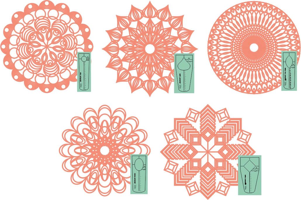 Create many different quilting designs which use a circle base, such as baptist fans, mandalas and many more. This 5pc Set includes: