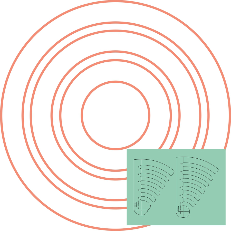 Circles on Quilts Templates are used for quilting concentric circles. These templates allow you to quilt circles at 1″ increments from 2″ – 12″ in full inches. Can be used to make baptist fans. Using our single pin system, there is only 1 point of rotation, which reduces movement. For use with domestic machines when fit with the Westalee Ruler Foot