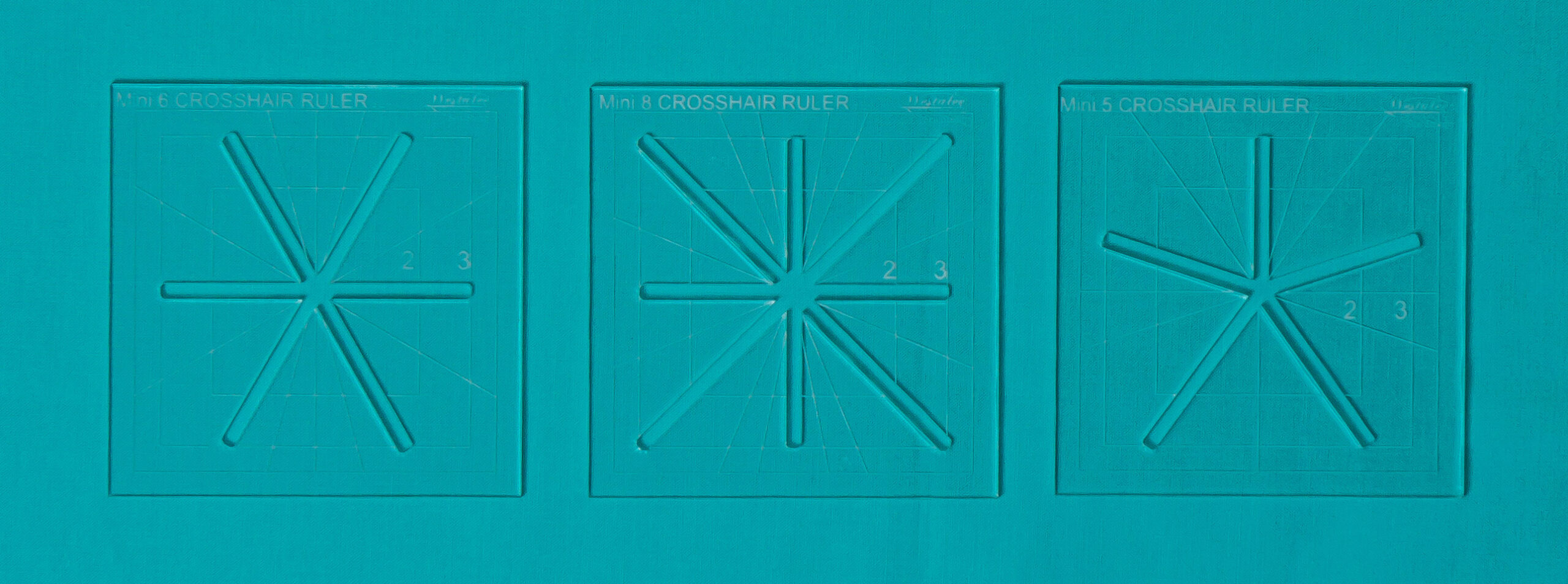 4-1/2″ Cross Hair Square Set, includes 1 each: 5 point, 6 point and 8 point. Great tools for marking reference lines to use when creating circular designs where you want even repeats. Use to center designs in a block.