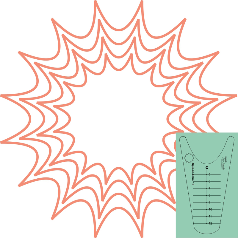 The Spin An Echo Templates will stitch up to 12″ with different start points. Depending on the design you are looking for templates can start stitching at 2″. Spin An Echo Templates have been designed to be used with marked reference lines, using our Stitch and Rotate Quilting Method.The Spin An Echo Templates can be used with any of our Quilting Templates to create your own unique quilting designs.