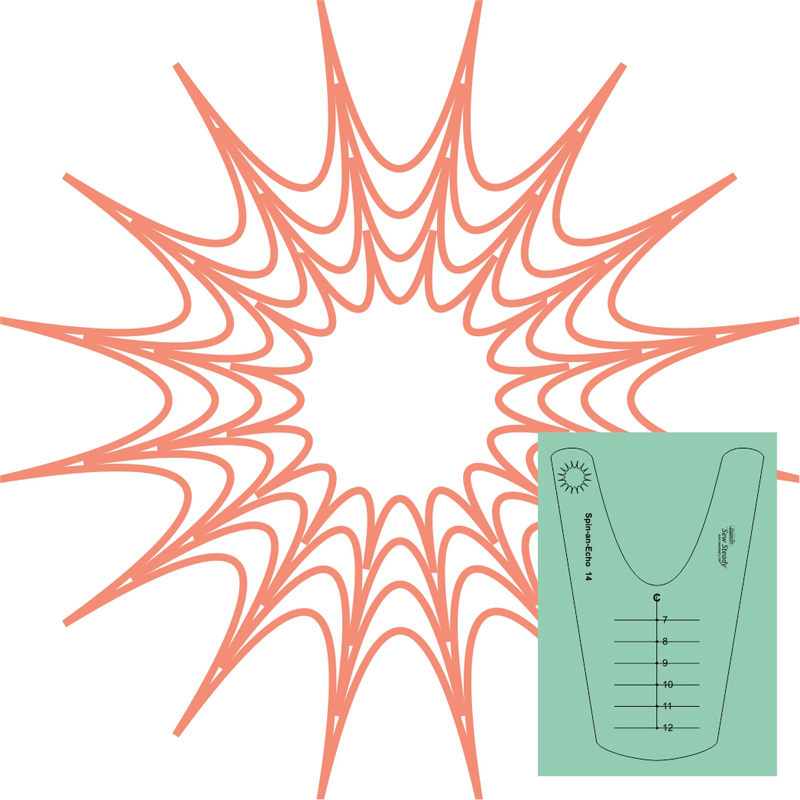 The Spin An Echo Templates will stitch up to 12″ with different start points. Depending on the design you are looking for templates can start stitching at 2″. Spin An Echo Templates have been designed to be used with marked reference lines, using our Stitch and Rotate Quilting Method.The Spin An Echo Templates can be used with any of our Quilting Templates to create your own unique quilting designs.