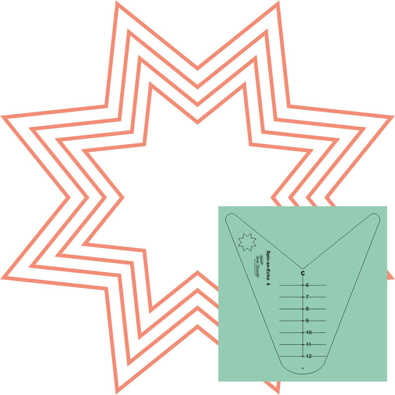 The Spin An Echo Templates will stitch up to 12″ with different start points. Depending on the design you are looking for templates can start stitching at 2″. Spin An Echo Templates have been designed to be used with marked reference lines, using our Stitch and Rotate Quilting Method.The Spin An Echo Templates can be used with any of our Quilting Templates to create your own unique quilting designs.
