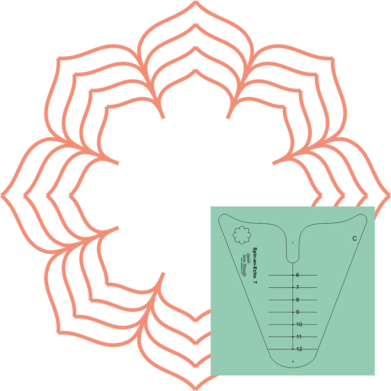 The Spin An Echo Templates will stitch up to 12″ with different start points. Depending on the design you are looking for templates can start stitching at 2″. Spin An Echo Templates have been designed to be used with marked reference lines, using our Stitch and Rotate Quilting Method.The Spin An Echo Templates can be used with any of our Quilting Templates to create your own unique quilting designs.