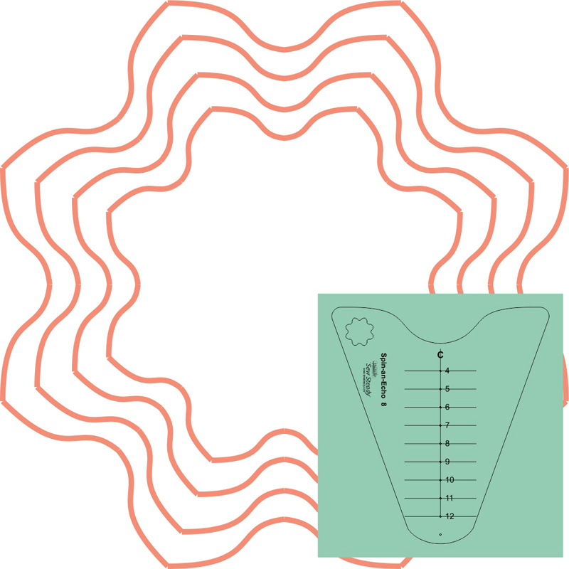 The Spin An Echo Templates will stitch up to 12″ with different start points. Depending on the design you are looking for templates can start stitching at 2″. Spin An Echo Templates have been designed to be used with marked reference lines, using our Stitch and Rotate Quilting Method.The Spin An Echo Templates can be used with any of our Quilting Templates to create your own unique quilting designs.
