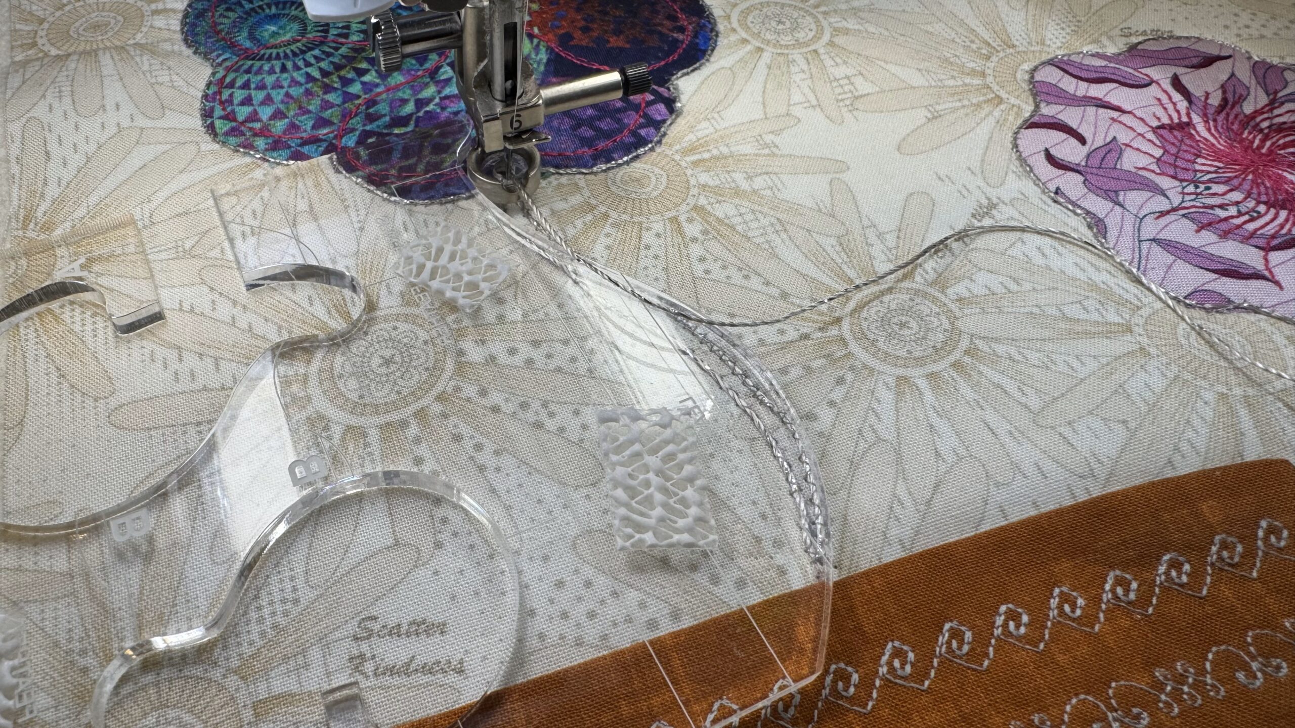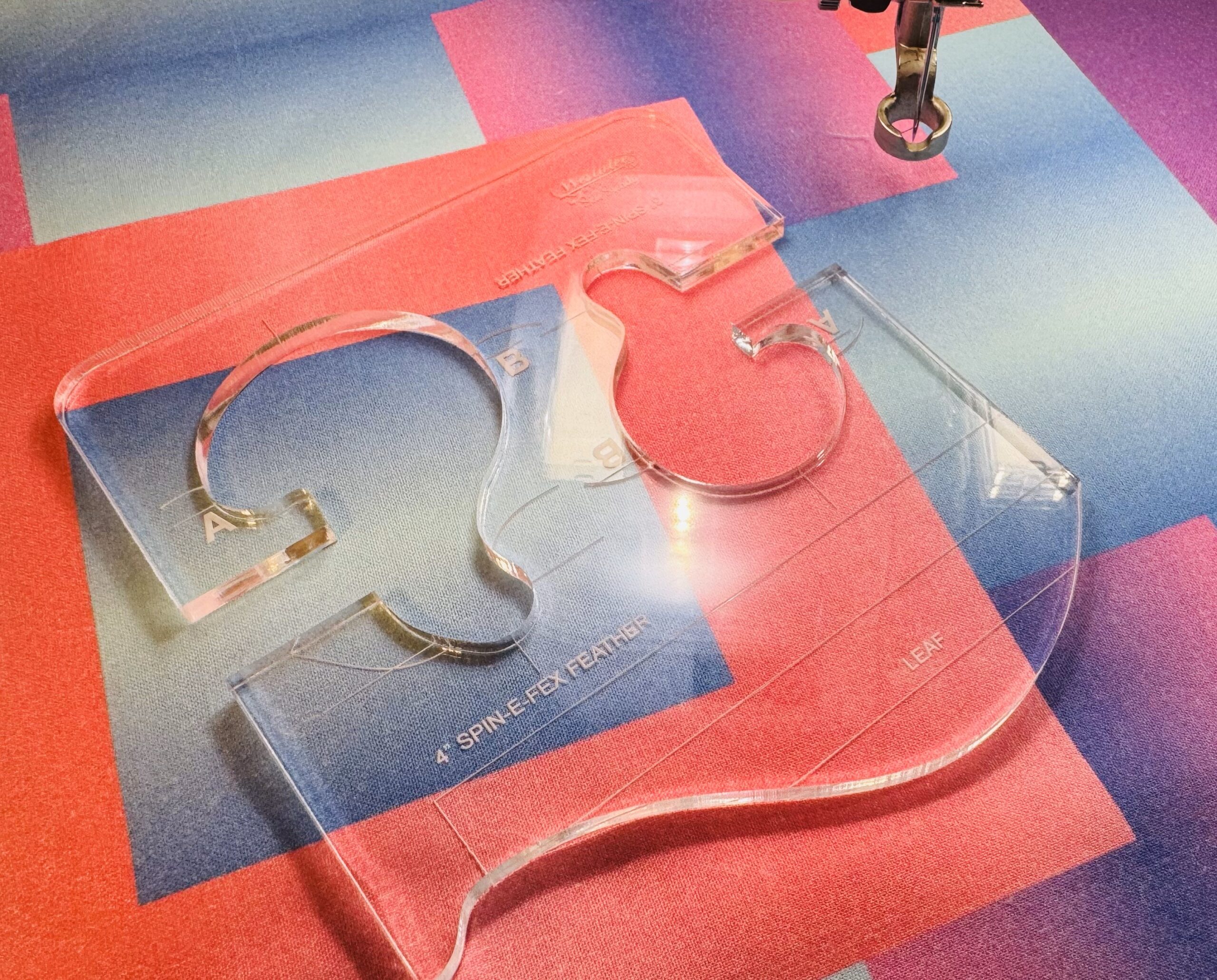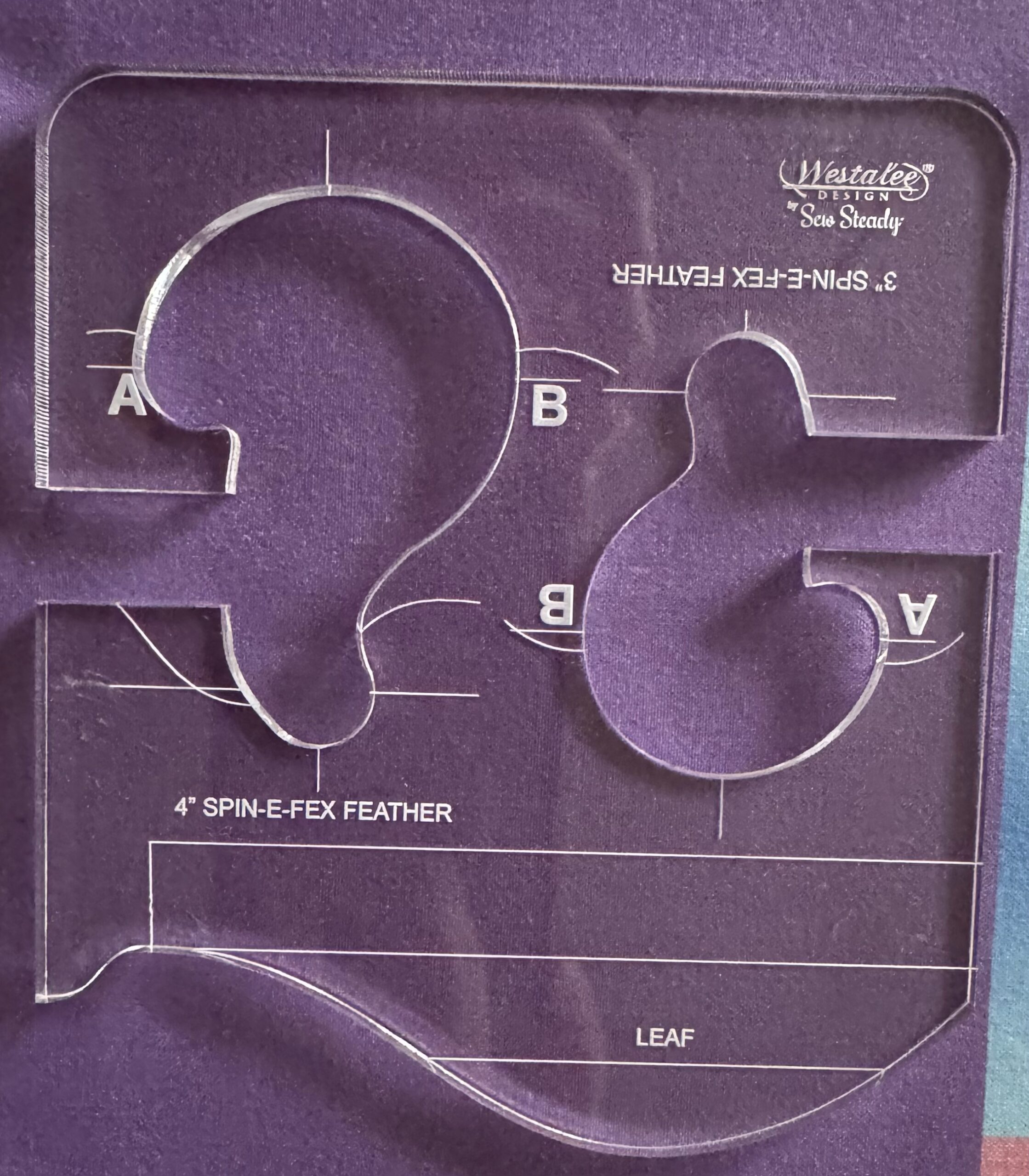 NEW! Spin-e-fex Feather 3″ & 4″ Template! This combo Template gives both 3″ and 4″ stitched rotating feather designs, plus a leaf design. Introduced as part of our Spring 2025 Elevate Club Box.